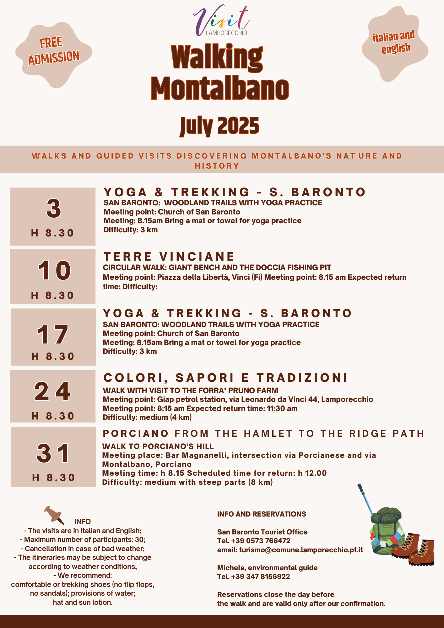 Again, starting from the Church of San Baronto, a medium difficulty 3 km walk followed by a yoga session.