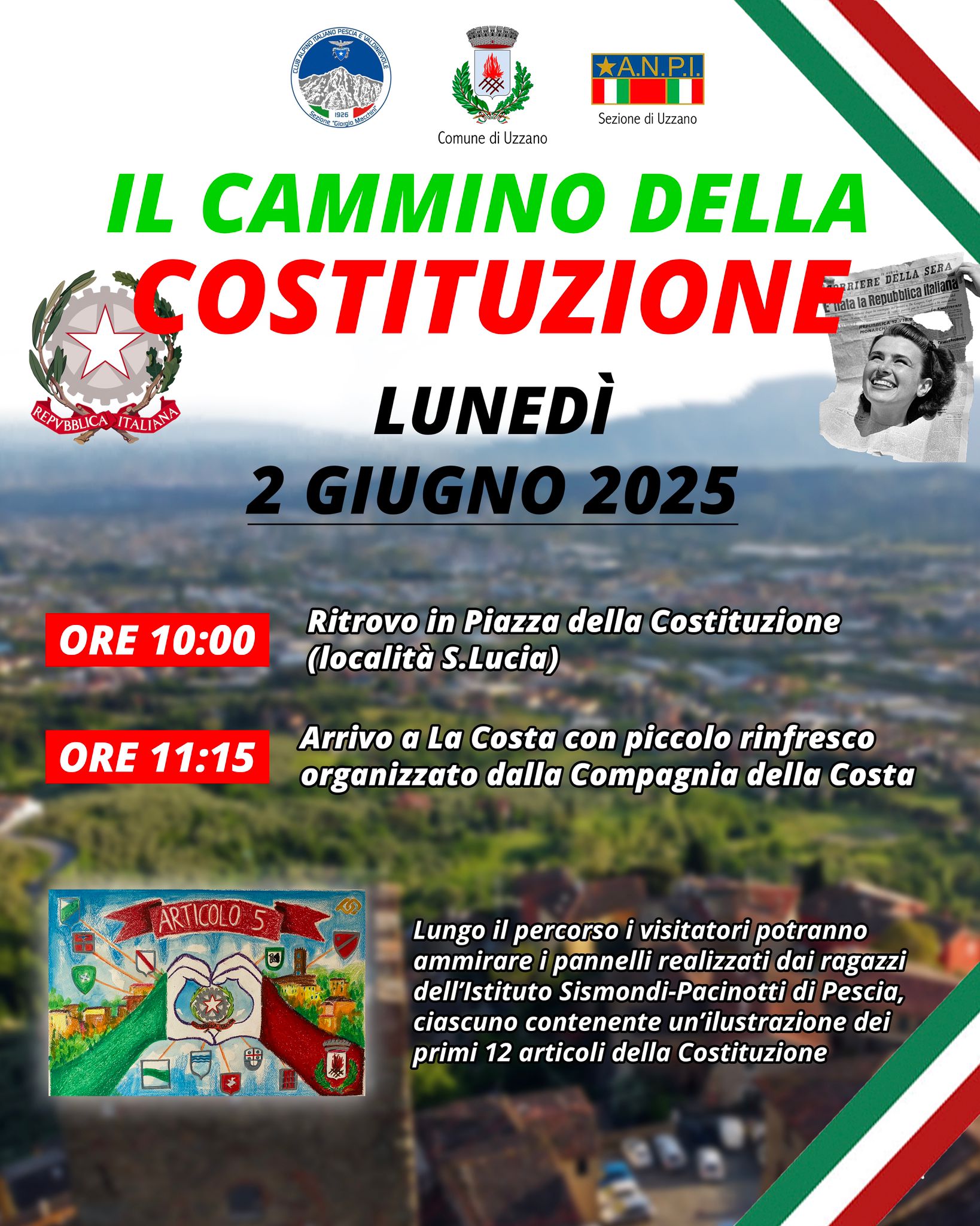 In occasione della Festa della Repubblica, lunedì 2 giugno 2025, il Comune di Uzzano organizza una passeggiata lungo il Cammino della Costituzione.