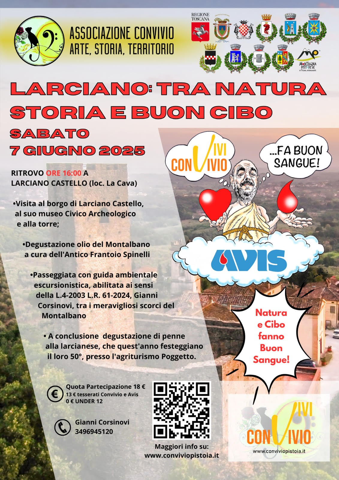A seguire, degustazione di olio extravergine del Montalbano a cura dell’Antico Frantoio Spinelli. La giornata si concluderà con l’assaggio delle celebri penne alla larcianese, piatto tipico della tradizione locale.