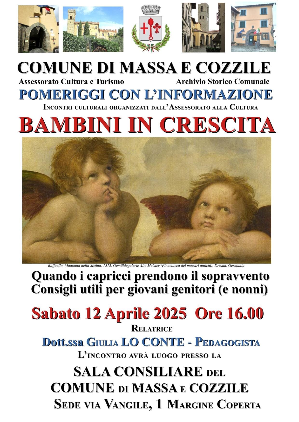 Sabato 12 aprile 2025, alle ore 16, presso la sala Consiliare del Comune di Massa e Cozzile, incontro con la pedagogista Giulia Lo Conte che affronterà l’argomento Bambini in crescita – Quando i capricci prendono il sopravvento dando consigli utili per giovani genitori e nonni.