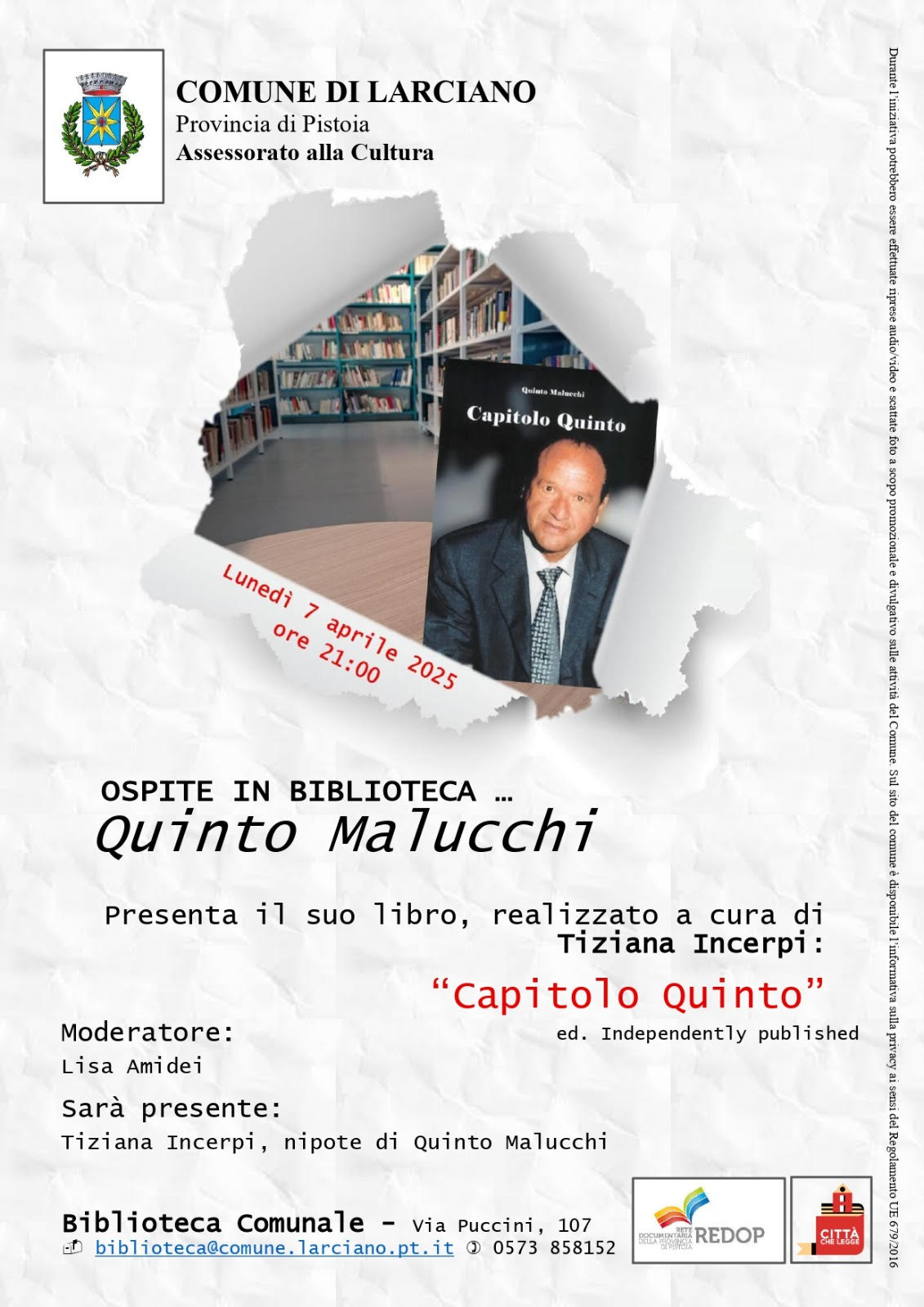 Lunedì 7 aprile 2025, alle ore 21, presso la Biblioteca di Larciano, Quinto Malucchi presenta il suo libro Capitolo Quinto. Modera Lisa Amidei. Sarà presente Tiziana Incerpi, nipote dell’autore.