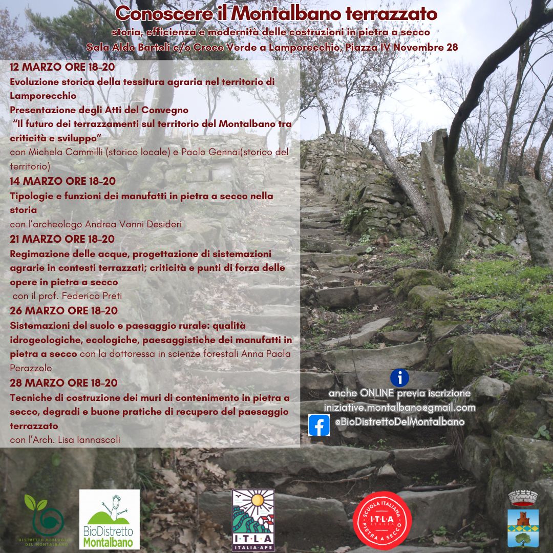 Da mercoledì 12 a venerdì 28 marzo 2025, presso la sede della Croce Verde di Lamporecchio, cinque cinque incontri per conoscere il Montalbano terrazzato: storie, efficienza e modernità delle costruzioni in pietra a secco.