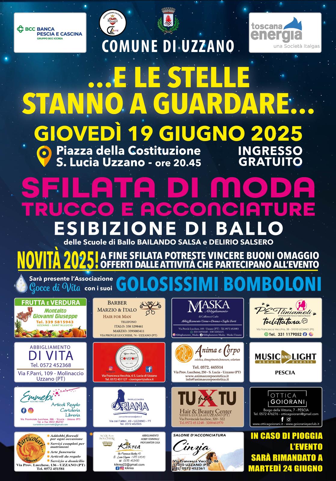 Giovedì 19 giugno 2025, alle ore 20.45, in Piazza della Costituzione a Uzzano, sfilata di moda, trucco e acconciature E le stelle stanno a guardare, con la partecipazione delle attività commerciali.