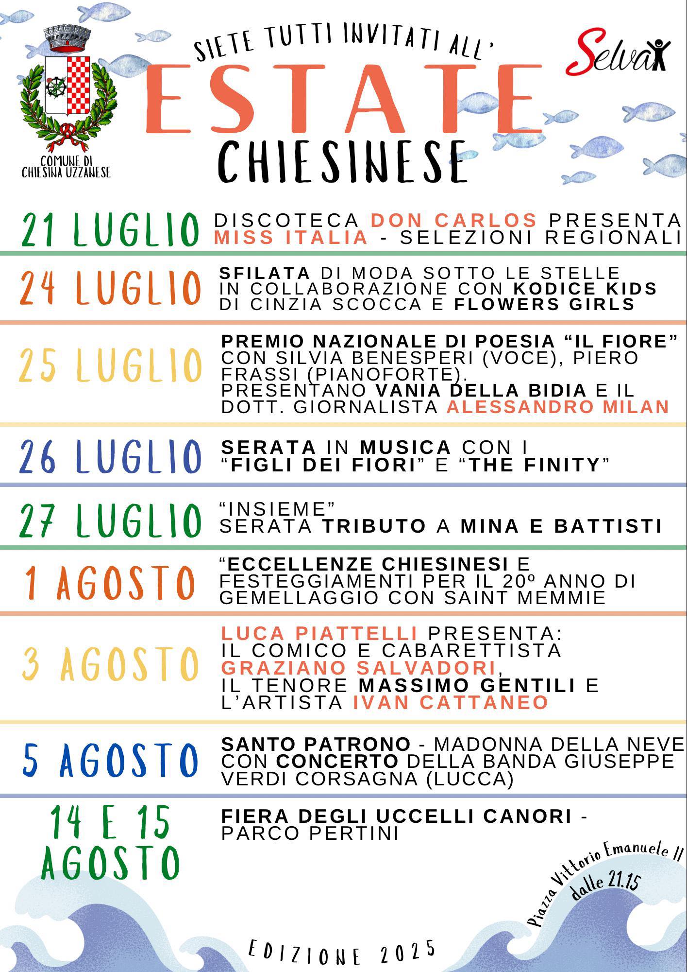Immergetevi nell’Estate Chiesinese 2025 con un calendario ricco di eventi dedicati a tutte le età. Dal 21 luglio al 15 agosto 2025, vi aspettano numerose occasioni speciali tra cultura, musica e tradizioni popolari.