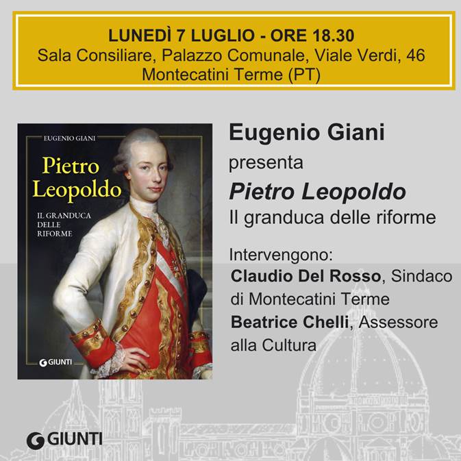 Lunedì 7 luglio 2025, alle ore 18.30, nella Sala Consiliare del Palazzo Comunale di Montecatini Terme, sarà ospite il Presidente della Regione Toscana, Eugenio Giani, per la presentazione del suo ultimo lavoro letterario: Pietro Leopoldo – Il Granduca delle riforme (Giunti Editore, 2025).