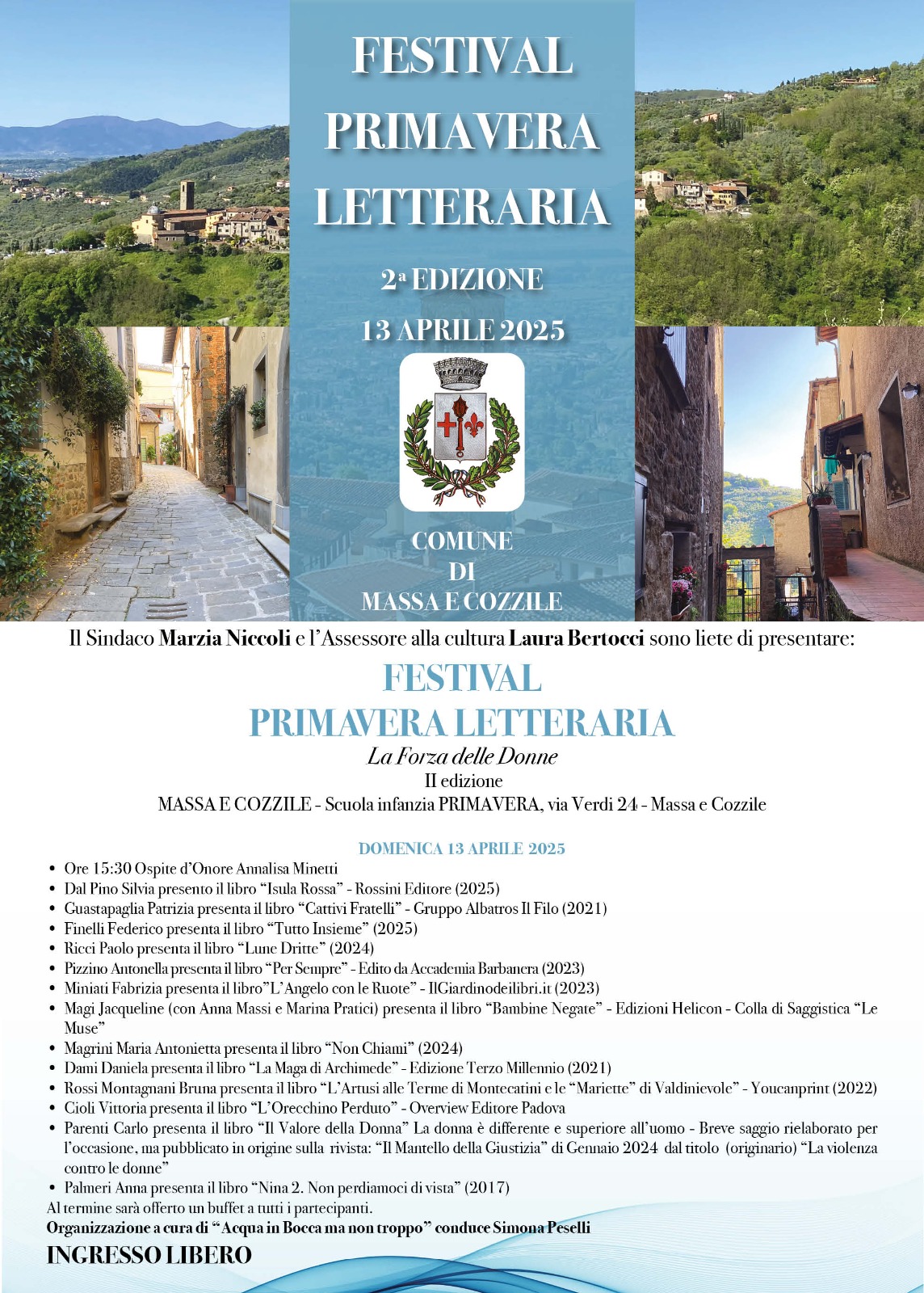 Domenica 13 aprile 2025, dalle ore 15.30, presso la Scuola dell’infanzia Primavera di Massa e Cozzile, torna, con la sue seconda edizione, l’appuntamento con Festival Primavera Letteraria.