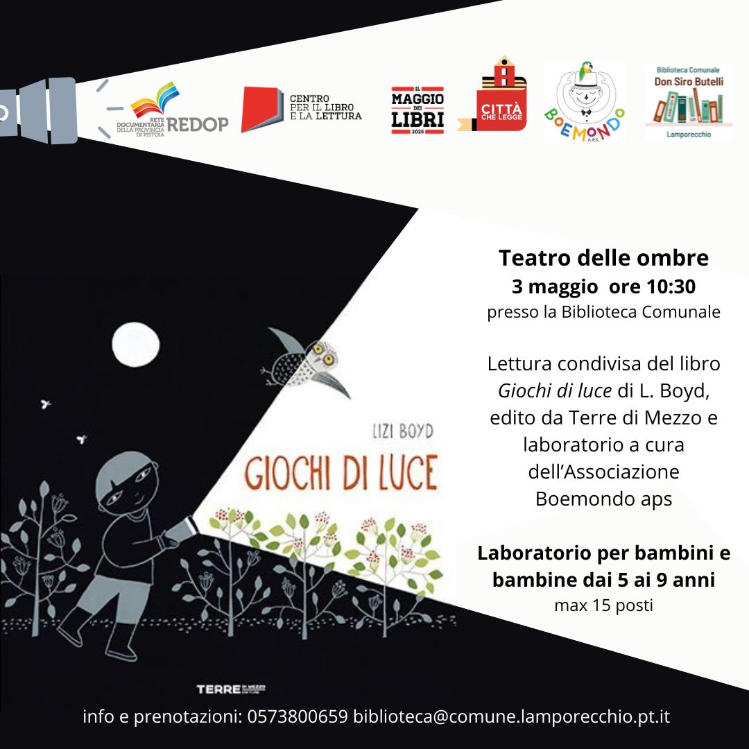 Sabato 3 maggio 2025 alle ore 10.30, la Biblioteca di Lamporecchio ospiterà l’Associazione Boemondo aps per un appuntamento speciale di lettura condivisa e laboratorio creativo dedicato al teatro delle ombre.
