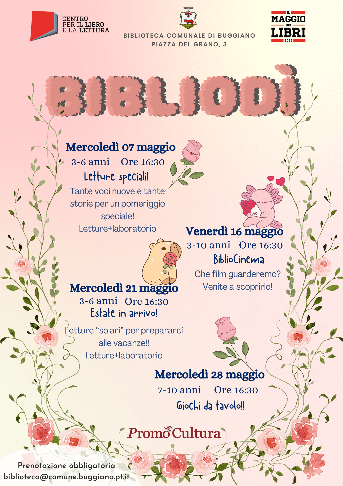 Continuano anche per il mese di maggio 2025 i Bibliodì: quattro appuntamenti per i più piccoli tra letture ad alta voce, laboratori creativi, proiezioni di film e tornei di giochi da tavolo alla Biblioteca di Buggiano.