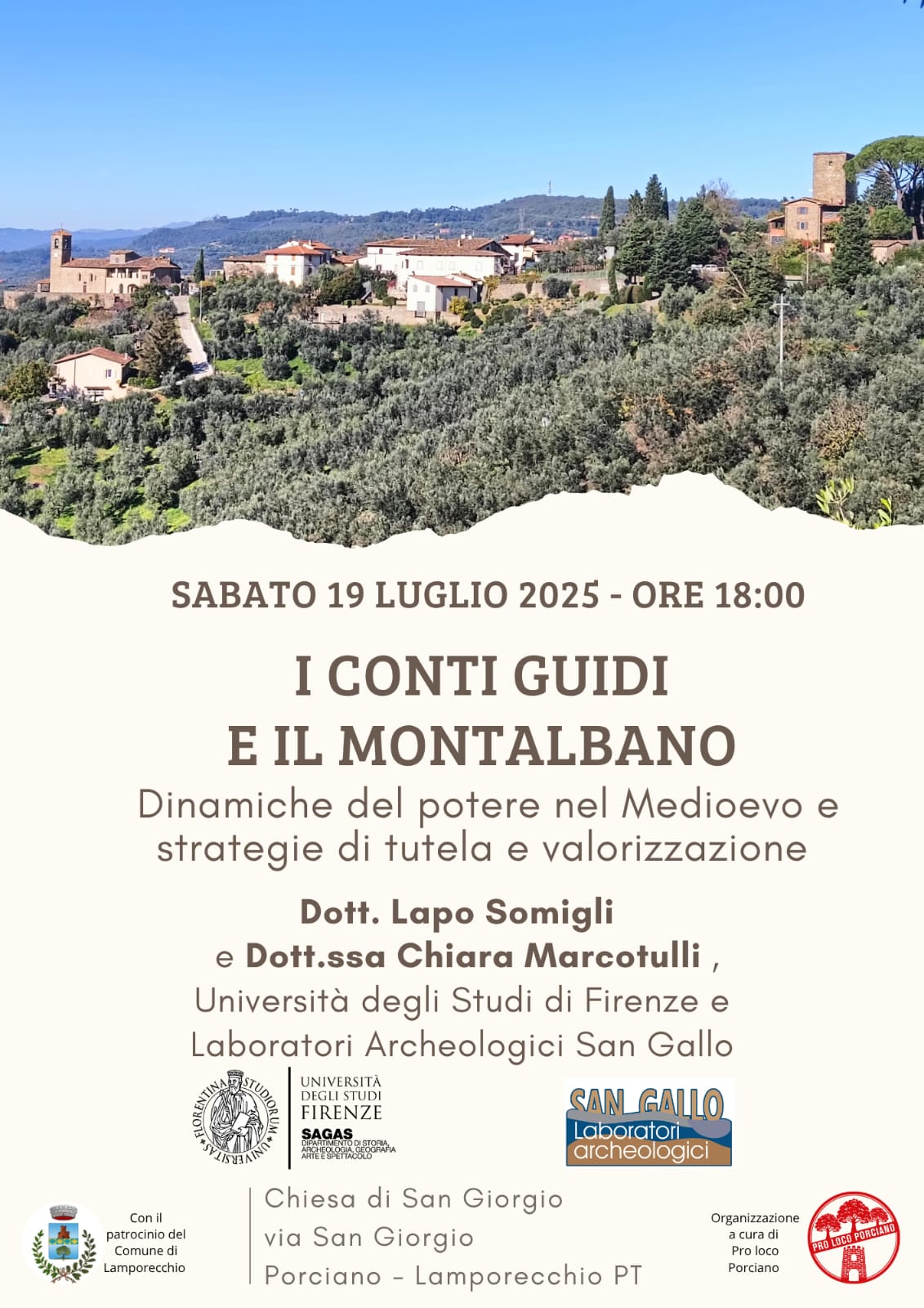 Sabato 19 luglio 2025, alle ore 18, presso la Chiesa di San Giorgio a Porciano, Lamporecchio, incontro I conti Guidi e il Montalbano. Dinamiche del potere nel Medioevo e strategie di tutela e valorizzazione.