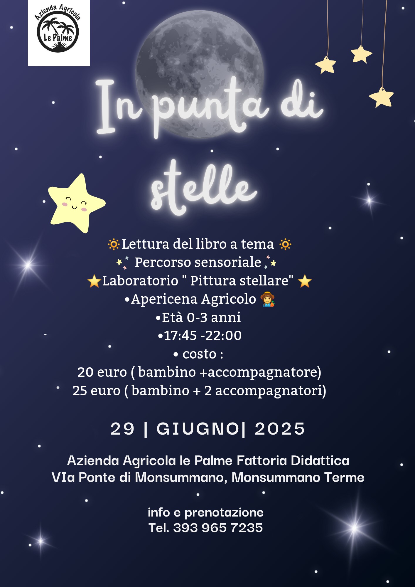 Sabato 29 giugno 2025, dalle 17.45 alle 22, l’Azienda agricola Le Palme – Fattoria Didattica, a Monsummano Terme, aprirà le sue porte per In punta di stelle, un pomeriggio speciale dedicato ai bambini da 0 a 3 anni.