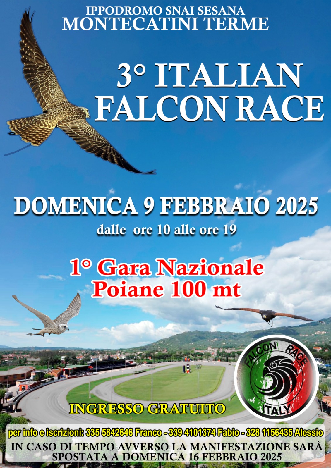 Domenica 9 febbraio 2025, dalle ore 10 alle 19, l’ippodromo Snai Sesana di Montecatini Terme ospiterà l’Italian Falcon Race, la prima gara in assoluto in Italia di velocità dei falchi.