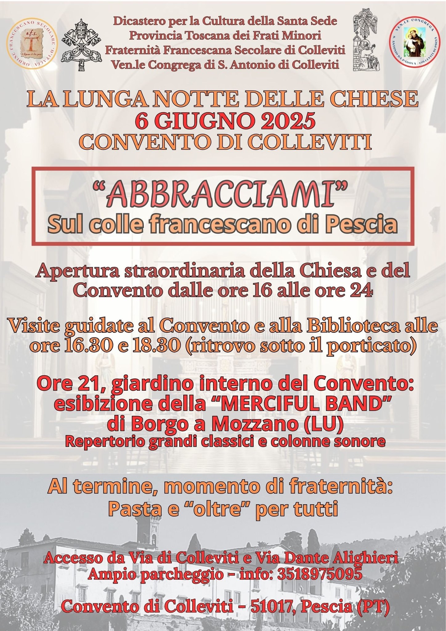 Venerdì 6 giugno 2025, anche il Convento di Colleviti di Pescia partecipa alla Lunga Notte delle Chiese, l’iniziativa nazionale che apre luoghi di culto in orari insoliti, trasformandoli in spazi di incontro tra spiritualità, cultura, arte e fraternità.