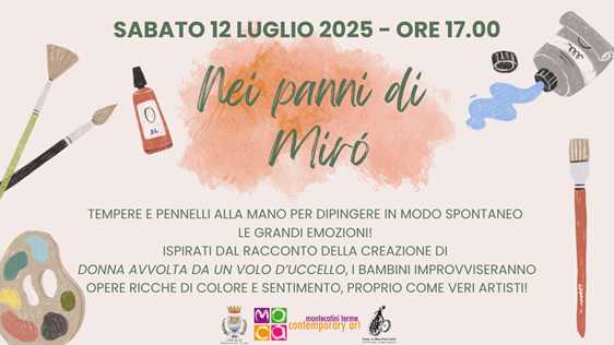 Sabato 12 luglio 2025, alle ore 17, presso la galleria Civica Mo.C.A. di Montecatini Terme, laboratorio per bambini Nei panni di Miró.