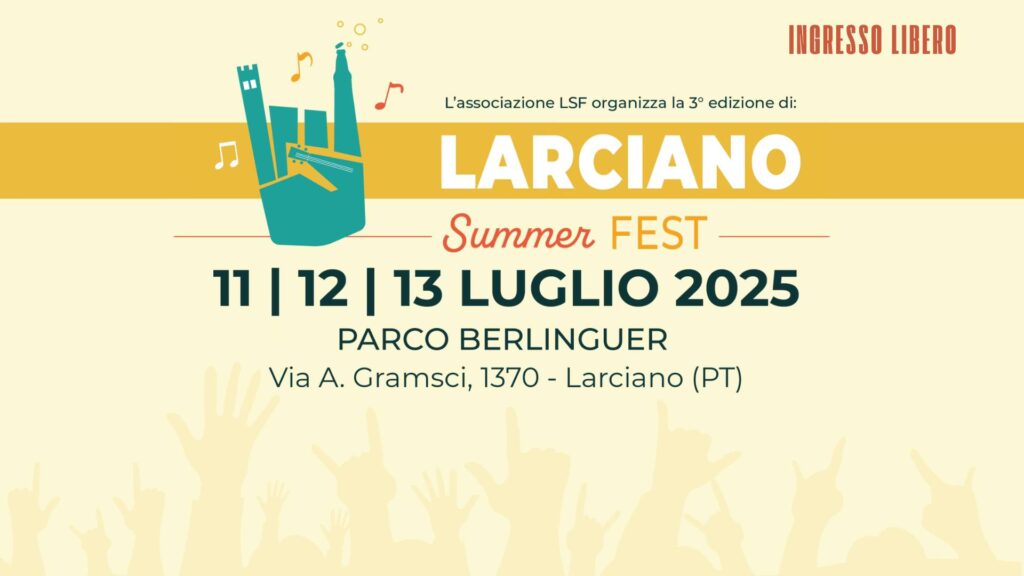 Con il Larciano Summer Fest, da venerdì 11 a domenica 13 luglio 2025, il Parco Enrico Berlinguer di Larciano si trasformerà in un grande spazio di festa: tre serate da vivere all’insegna del buon cibo, della musica e del divertimento per tutte le età.