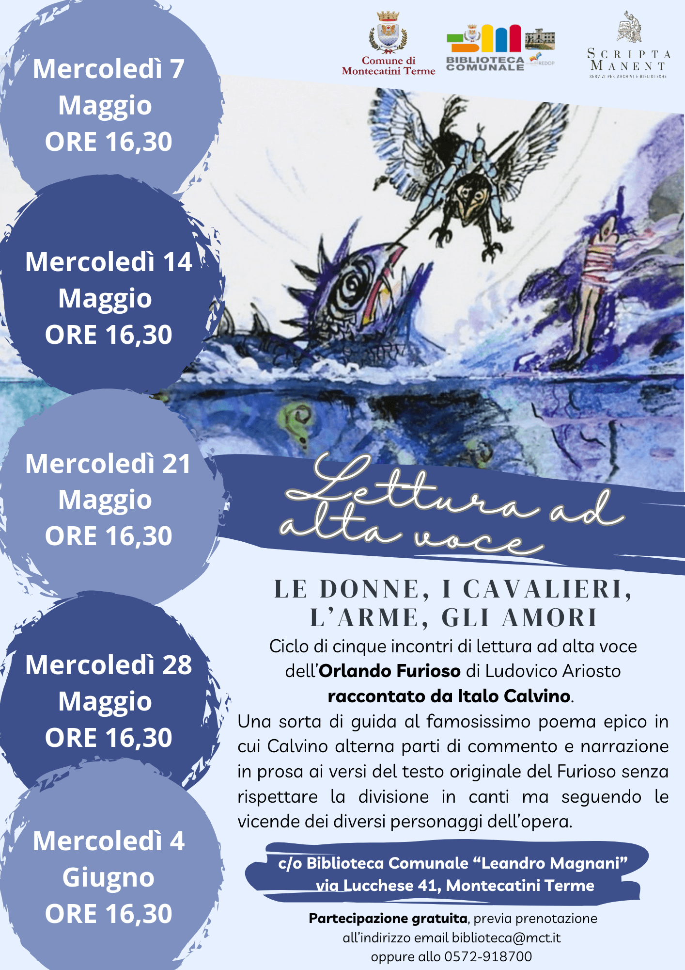 In occasione della Giornata Mondiale del Libro e del Diritto d’Autore, la Biblioteca Leandro Magnani di Montecatini Terme vi invita al ciclo di incontri Le donne, i cavalieri, l’arme, l’amore. Lettura ad alta voce dell’Orlando Furioso raccontato da Italo Calvino.