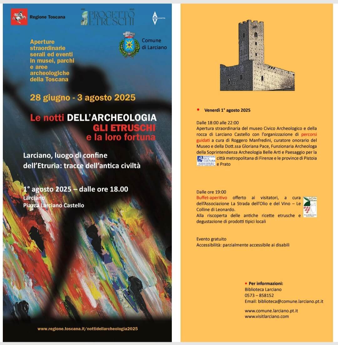 Per Le Notti dell’Archeologia – Gli etruschi e la loro fortuna, venerdì 1 agosto 2025, dalle ore 18, apertura straordinaria del Museo Civico Archeologico di Larciano Castello.