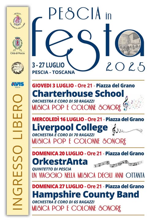 Da giovedì 3 a domenica 27 luglio 2025, in piazza del Grano a Pescia, tornano i tradizionali concerti organizzati dall’Associazione Quelli con Pescia nel cuore. Un appuntamento ormai fisso, per vivere insieme le serate estive all’insegna della musica e della convivialità nel cuore della città.