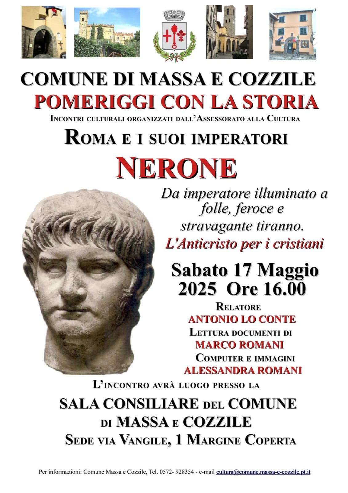 All’interno degli appuntamenti di Pomeriggi con la storia, sabato 17 maggio 2025, alle ore 16, presso la Sede Comunale del Comune di Massa e Cozzile di Margine Coperta, incontro culturale dal titolo Nerone – Da imperatore illuminato a folle, feroce e stravagante tiranno, a cura del dottor Antonio Lo Conte.