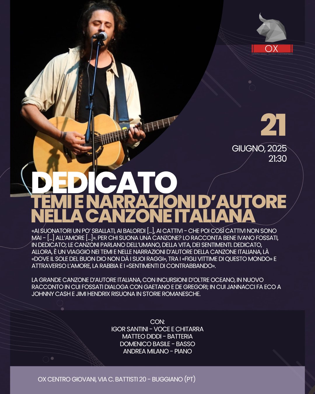 Per il Ciclo Retrospettive all’OX, sabato 21 giugno 2025, alle ore 21.30, all’OX Centro Giovani a Borgo a Buggiano, appuntamento con Dedicato, un viaggio nella grande canzone d’autore italiana, tra vita, sentimenti e storie di umanità.