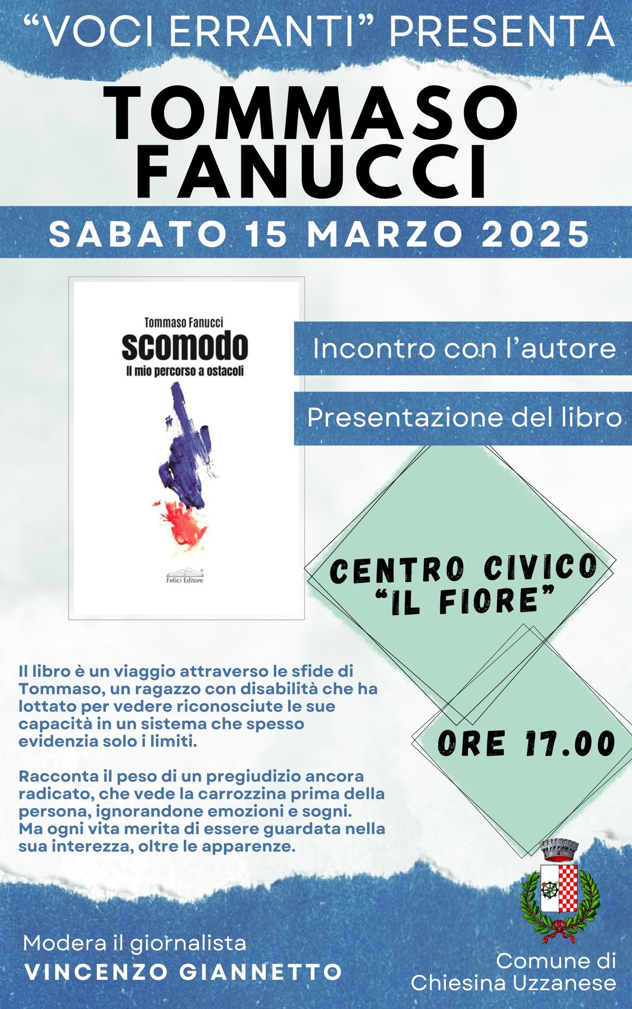 Appuntamento con le serate d’autore di Voci Erranti, sabato 15 marzo 2025, alle ore 17, presso il Centro Civico Il Fiore di Chiesina Uzzanese con Tommaso Fanucci, giornalista pubblicista, che presenterà il suo libro Scomodo. Il mio percorso a ostacoli