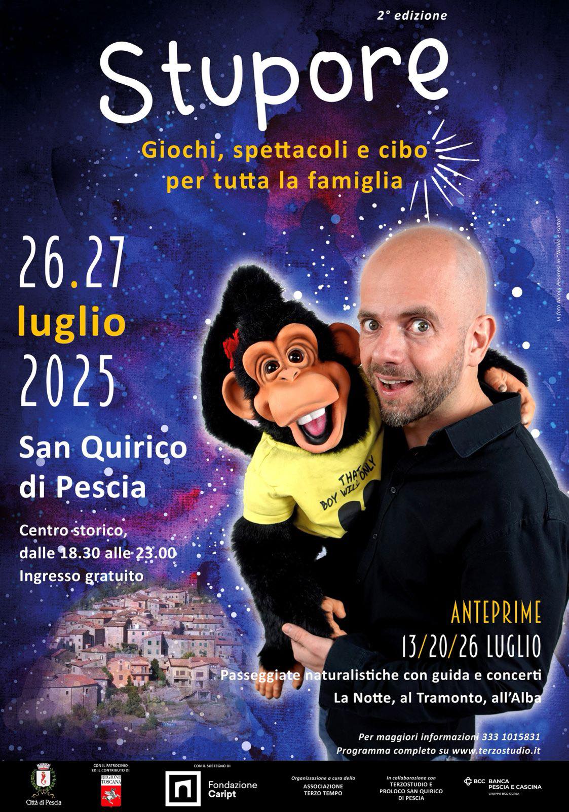 II edizione di Stupore Festival a San Quirico in Valleriana da sabato 26 a domenica 27 luglio 2025. In  programma due giorni di giochi, spettacoli e cibo per tutta la famiglia.