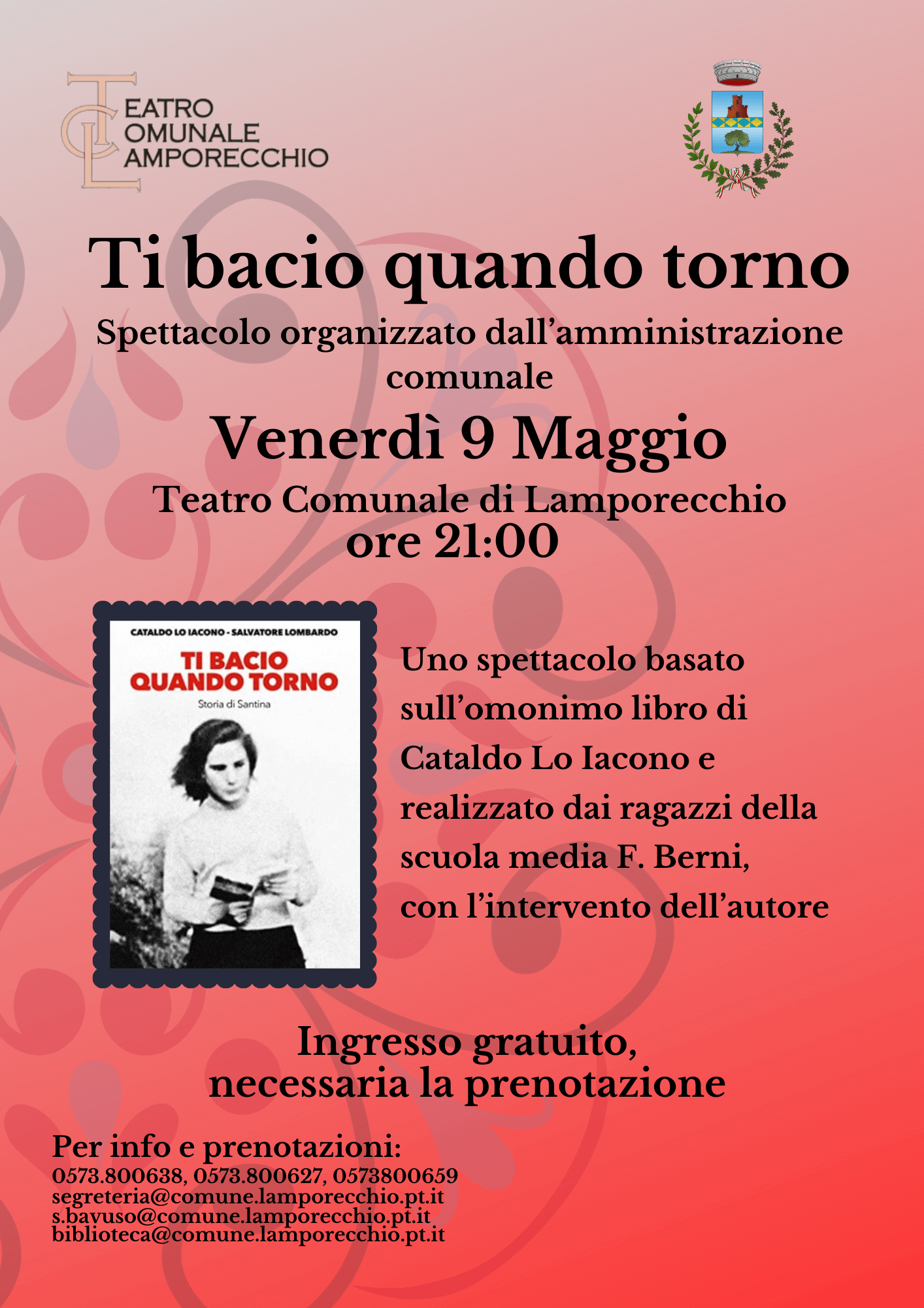 Venerdì 9 maggio 2025, alle ore 21, presso il Teatro comunale di Lamporecchio, andrà in scena presso lo spettacolo Ti bacio quando torno.