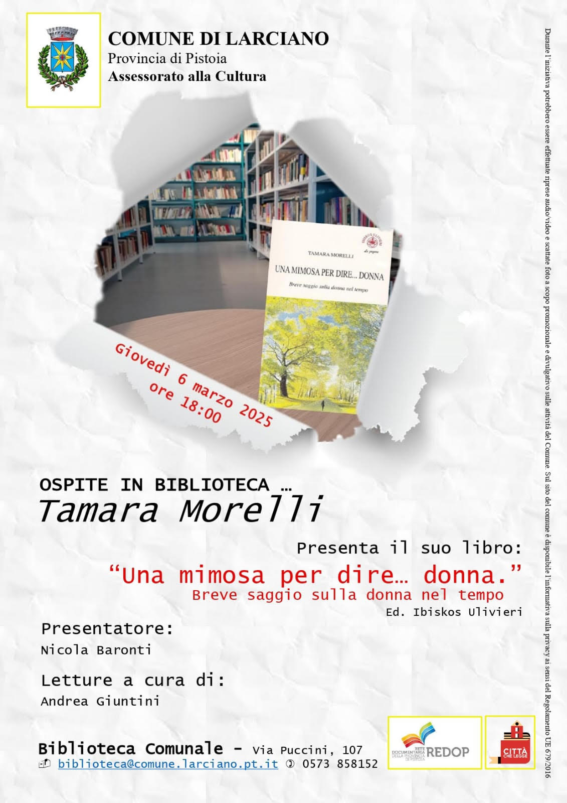 Presso la Biblioteca Comunale di Larciano, giovedì 6 marzo 2025, alle ore 18, presentazione del libro Una mimosa per dire… donna. Breve saggio sulla donna nel tempo (Ed. Ibiskos Ulivieri) di Tamara Morelli.