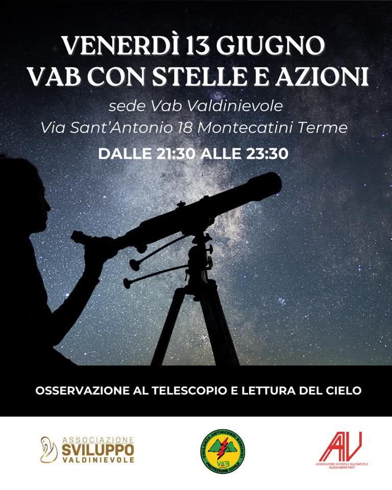 Venerdì 13 giugno 2025, dalle 21.30 alle 23.30, presso la sede della VAB Valdinievole, osservazione guidata del cielo con l’aiuto dei telescopi, dedicata alle costellazioni e al pianeta Marte. Durante la serata ci sarà spazio anche per domande e curiosità.