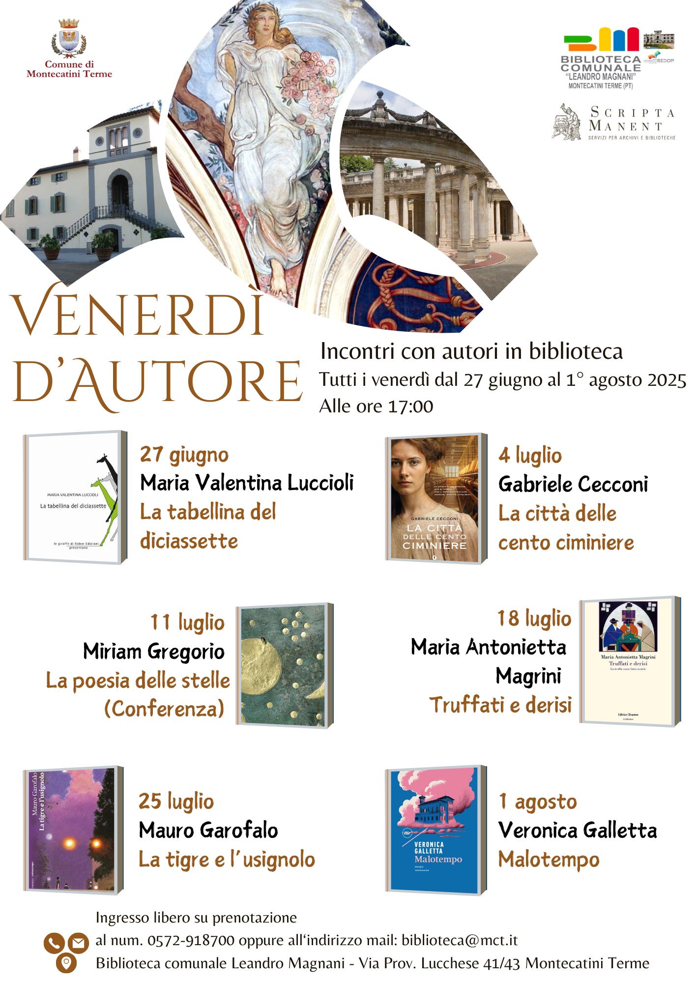 Da giugno ad agosto 2025, presso la Biblioteca Leandro Magnani di Montecatini Terme, rassegna di incontri con Venerdì d’autore. Tante occasioni per conoscere nuove letture e autori locali.