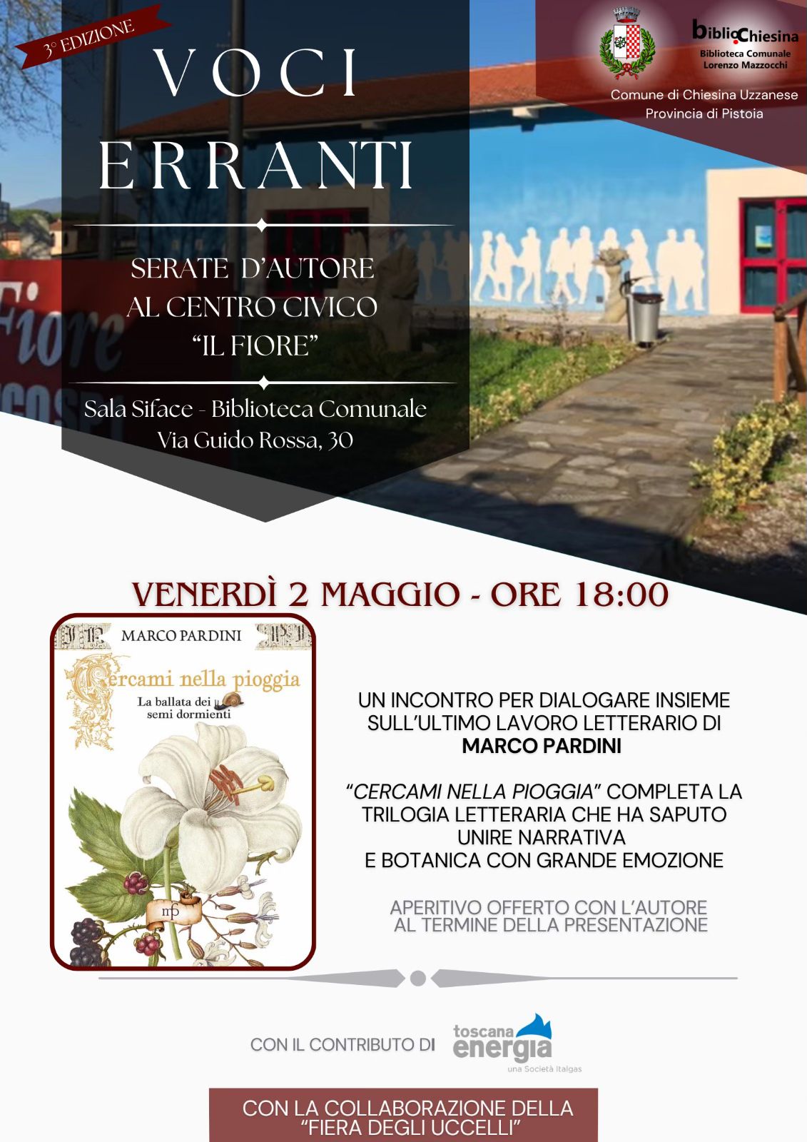 Venerdì 2 maggio 2025, alle ore 18, presso la Biblioteca Comunale di Chiesina Uzzanese, tornano le serate d’autore della rassegna Voci Erranti con la presentazione del libro Cercami nella pioggia – La ballata dei semi dormienti di Marco Pardini, scrittore, naturopata e ricercatore.